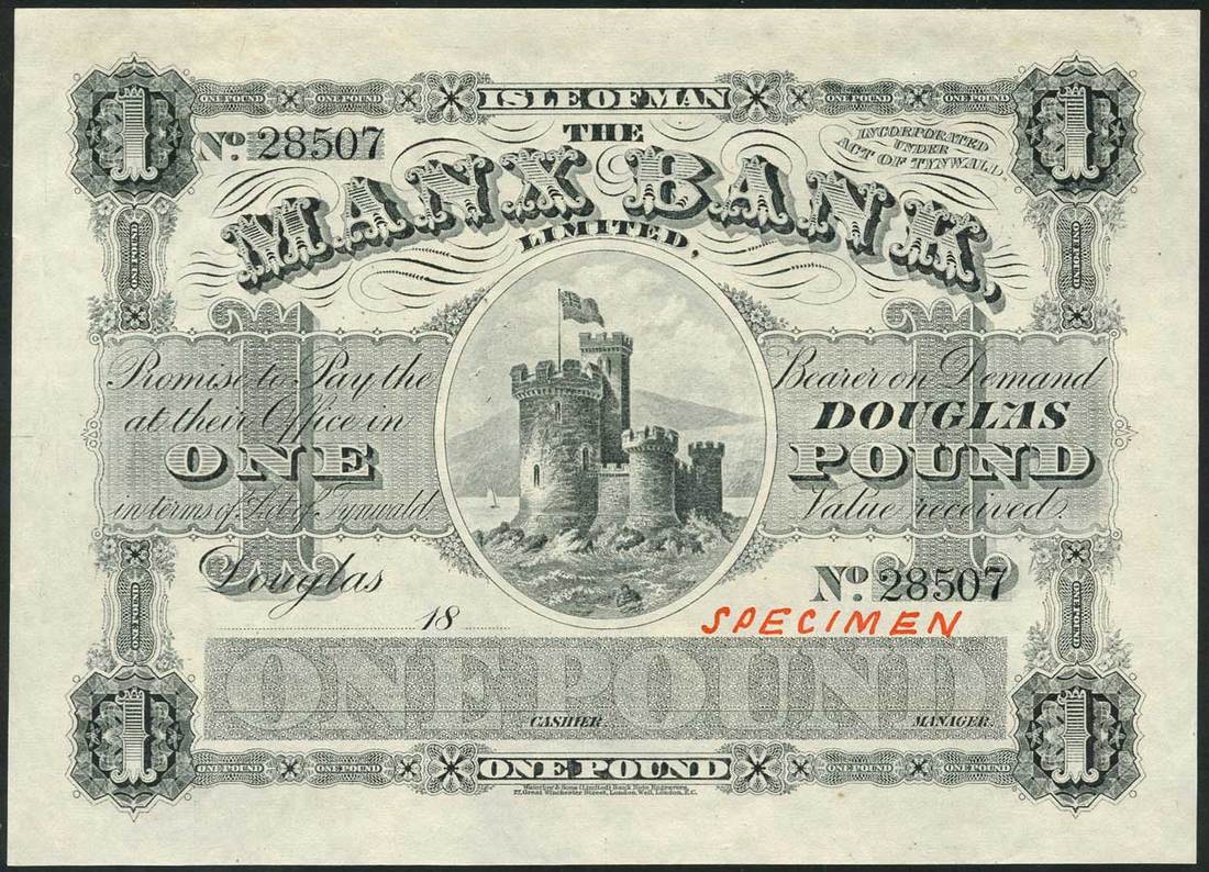 (x) Manx Bank Limited, Isle of Man, specimen £1, Douglas, 18- (ca 1900), serial number 28507, black, grey and white, the Tower of Refuge at centre, value at left and right and at each corner, reverse grey and white, triskeles at centre, vignettes of the Albert Tower, the Laxey wheel, Castle Rushen and St. Germains Cathedral in field