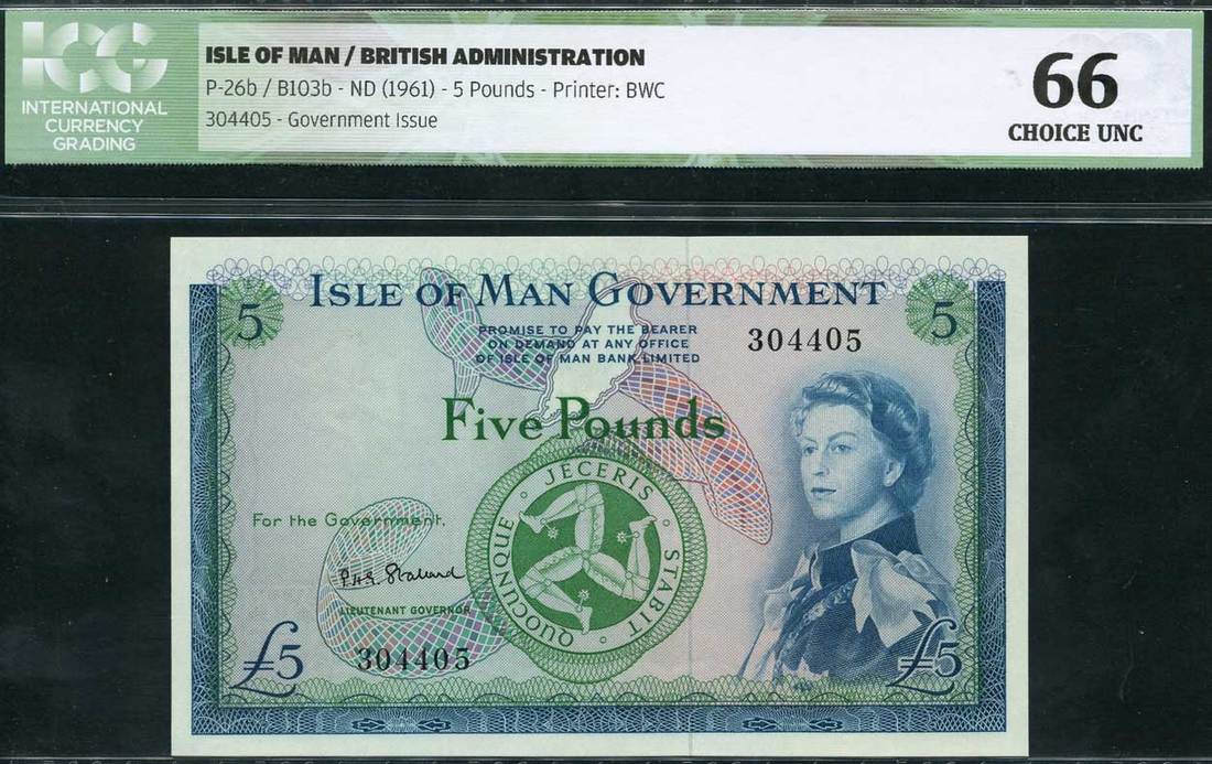 Isle of Man Government, £5, ND (1961), serial number 304405, blue and green on multicolour underprint, portrait Queen Elizabeth II at right, triskelion at centre, ornate border on three sides, reverse, Castle Rushen 1775 at centre