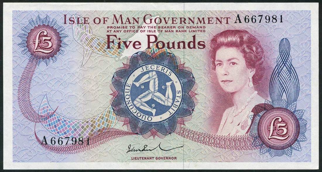 Isle of Man Government, £5, ND (1975), serial number A 667981, blue and purple, Elizabeth II at right, triskeles at centre, Paul signature
