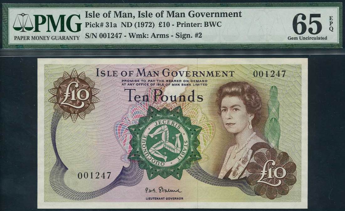 (Pick 31a, TBB B109), in PMG holder number 65 EPQ, gem uncirculated. A very rare note and a key note to the Isle of Man QEII series especially in the is grade