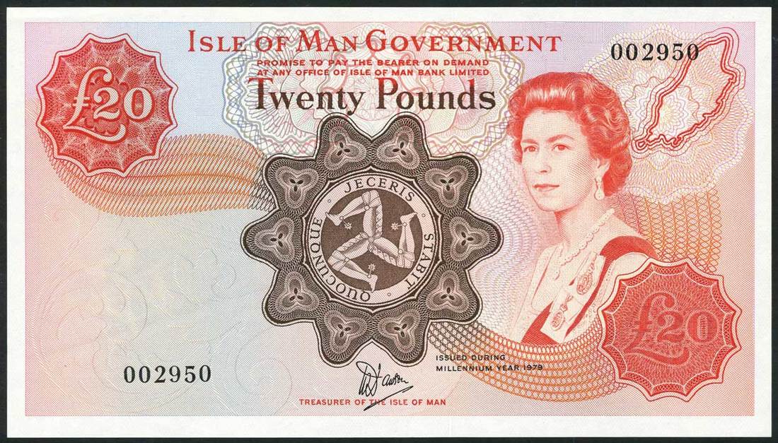 Isle of Man Government, £20, ND (1979), serial number 002950, red and brown, Elizabeth II at right, triskeles at centre, Dawson signature, 'Millennium' issue