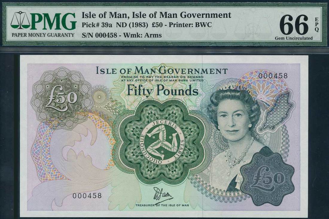 Isle of Man Government, £50, ND (1985), serial number 000458, blue, green and violet, portrait Queen Elizabeth II at right, triskelion at centre, reverse, illustration of Douglas Bay