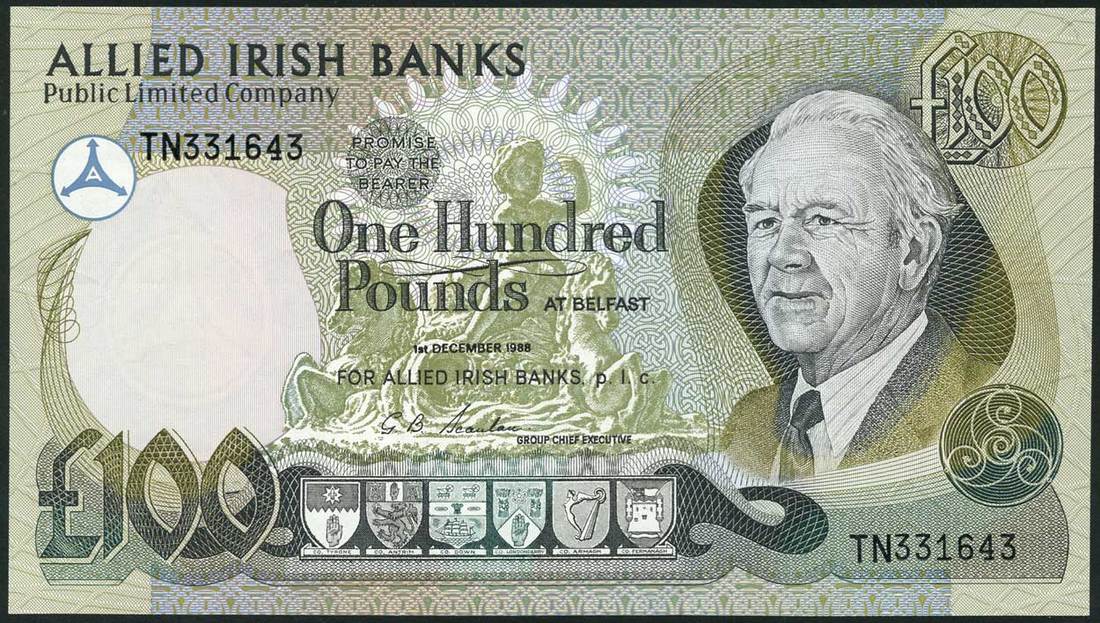 Allied Irish Banks plc, £100, 1 December 1988, serial number TN 331643, green, pale blue and lilac, male portrait at right, Scanlon signature
