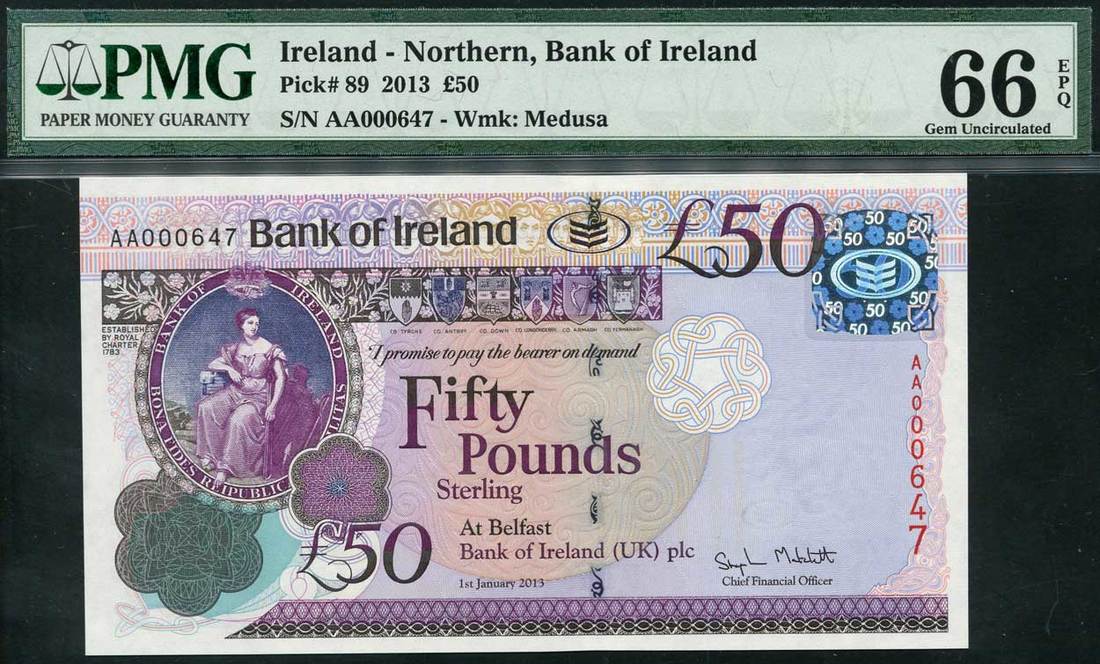 Bank of Ireland, £50, 2013, serial number AA 000647, purple on multicolour underprint, bank arms at left, bank title top centre left, coats of arms top centre, reverse, distillery