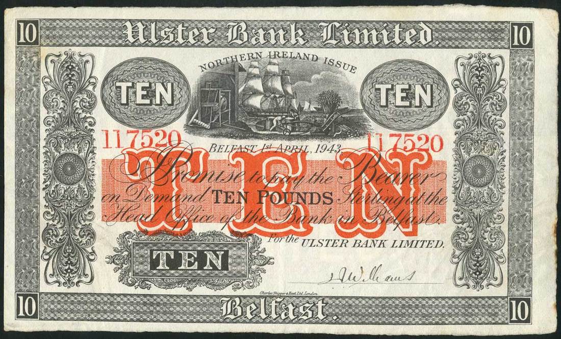 Belfast Banking Company Limited, £5, 1966, red prefix D/Z, black and white, value in red, £10, 1965, green prefix A/O, black and white, value in green, also Ulster Bank Limited, £10, 1943, red serial number 117520, black and white, value in red, all are handsigned