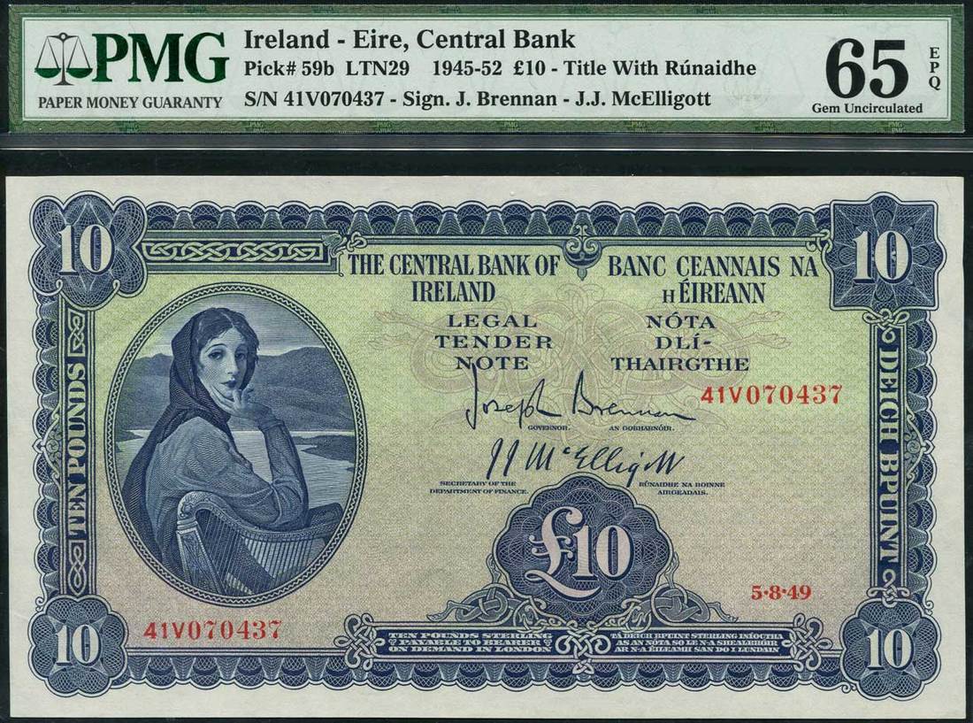 Central Bank of Ireland, £10, 5 August 1949, serial number 41V 070437, blue and green, portrait Lady Lavery at left, value in each corner and centre right, ornate border, reverse, River god