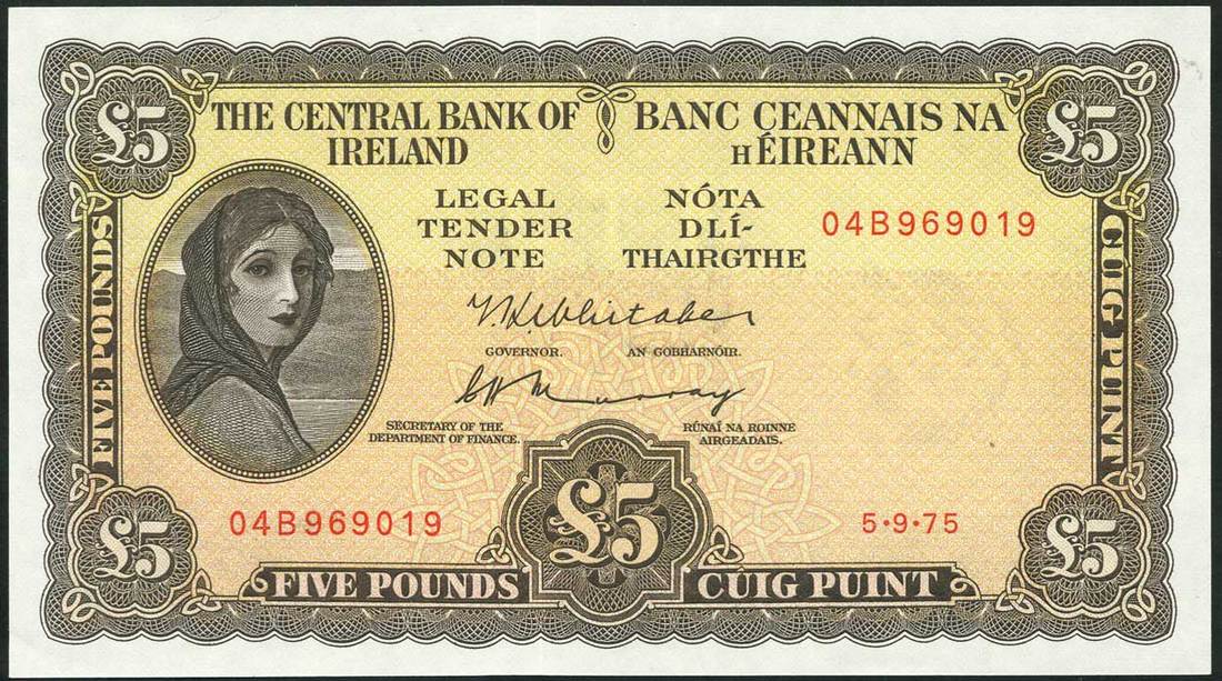 Central Bank of Ireland, £5 (3), 1955, 1957, 1975, serial numbers 67W834855, 72W807155 and 04B969019, brown on light yellow and orange underprint, portrait Lady Lavery at left, value in each corner and low centre, reverse, River God at centre, ornate border