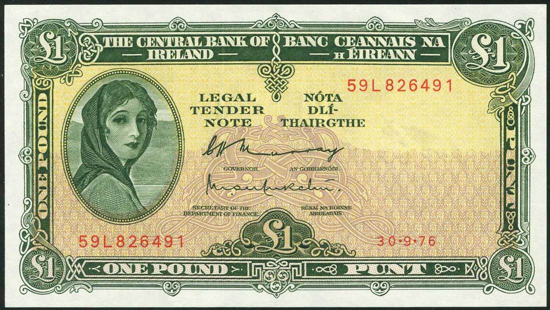 Central Bank of Ireland, 10 shillings, 1968, serial number 89P688480, £1, 1976, serial number 89P688480, orange and multicolour and green on multicolour respectively, both portrait Lady Lavery at left, reverse, beautiful guilloche patterns with representation of river god at centre