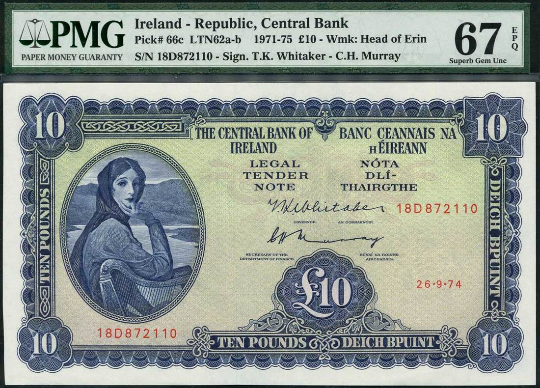 Central Bank of Ireland, £10, 26 September 1974, serial number 18D 872110, blue and green, portrait Lady Lavery at left, value in each corner and centre right, ornate border, reverse, River god