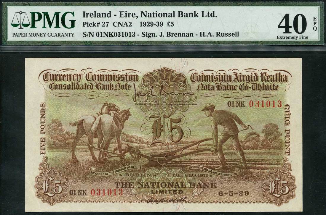 Currency Commission Consolidated Banknote, £5, 6 May 1929, serial number 01NK 031013, brown, green and lilac, ploughman and team at centre, Brennan and Gargan signatures, reverse St. Patrick's bridge, Cork at centre