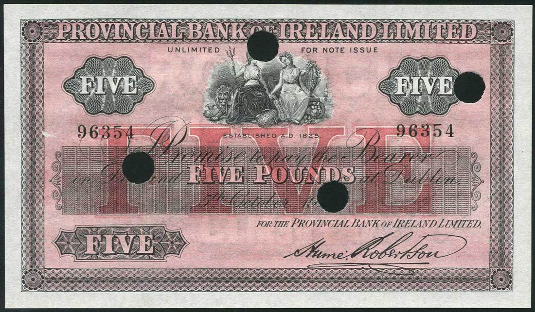 Provincial Bank of Ireland, £5, ND (1920-27), serial number 96354, pink and black, allegorical figures top centre, value in ornate tablets in three corners and at centre, reverse, green guilloche pattern