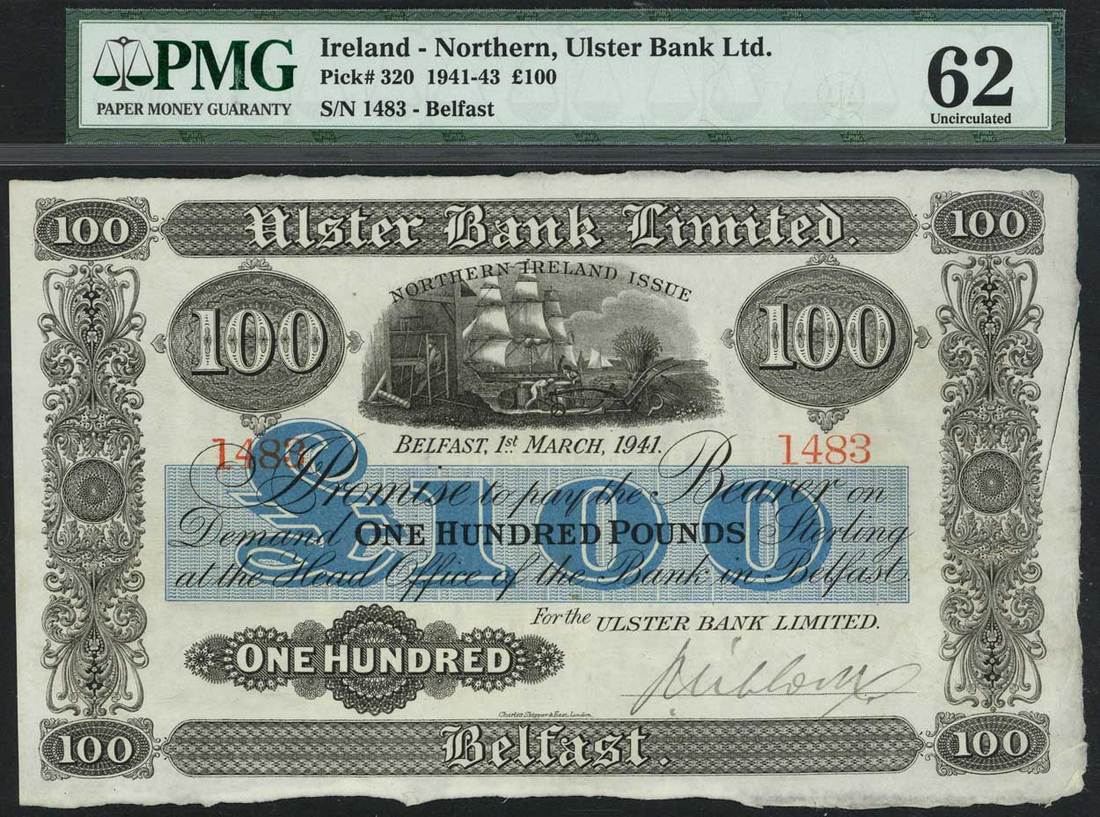 Ulster Banking Company, £100, 1 March 1941, serial number 1483, black and white, value in blue underprint at centre, allegorical symbols top centre, value in oval frame top left and right, manuscript signature low right, reverse blue, bank building at centre