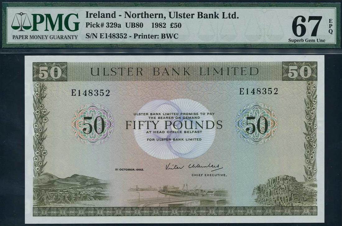 Ulster Bank Limited, £50, 1982, serial number E 148352, olive green and multicolour, views of Belfast along low margin, flowers at left and right, value in tablets at top left and right and also at centre in numerals and text, reverse, ornate border, coats of arms in each corner and at centre flanked by value