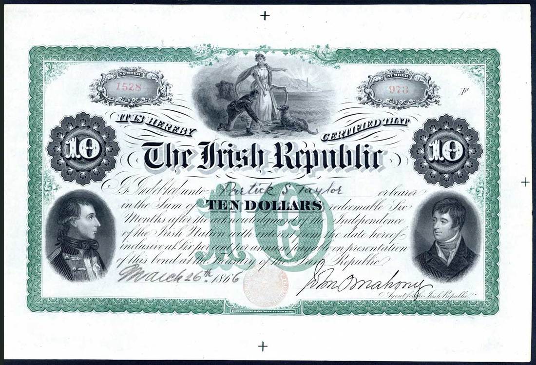 Irish Republican Fenian Bonds, $10, 26 March 1866, red serial number 1528-973, black on green and white, Erin with harp, soldier and wolf hound top centre, Theobald Wolfe Tone and Lord Edward Fitzgerald low left and right, payable to Patrick S Taylor at centre, printed signature of John Mahony low right