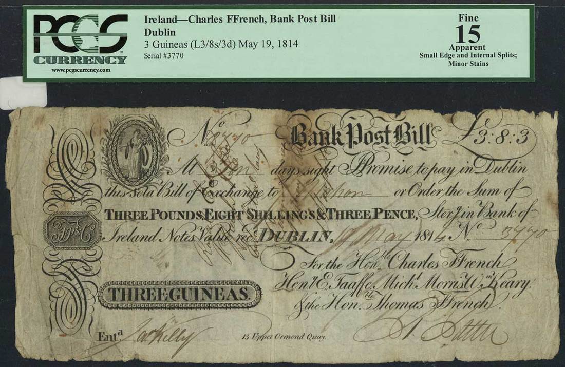 (x) Dublin Bank Post Bill, Charles Ffrench, £3, eight shillings and 3 pence, 19 May 1814, serial number 3770, black and white, maiden top left