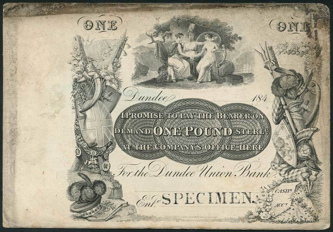 (x) Dundee Union Bank, proof on card for £1, ND (184-), black and white, showing three female allegories at top centre, armour, shields and uniforms at left and right