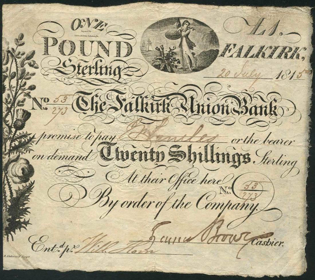 Falkirk Union Bank, 20 shillings/£1, 20 July 1815, serial number 53/273, black and white, allegorical maiden in oval frame top centre, border of thistles and roses at left, two manuscript signatures low centre