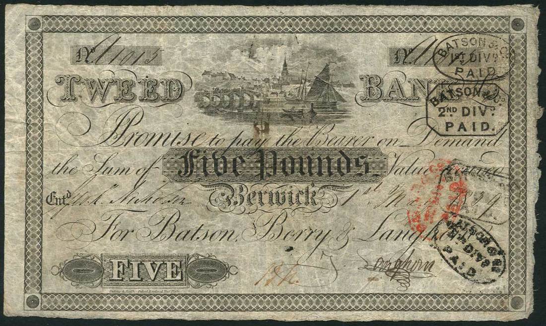 Tweed Bank, Batson Berry & Langhorn, £5, 1 May 1839, serial number 1015, uniface, black and white vignette of ships on River Tweed at Berwick top centre, value in tablet at centre and low left