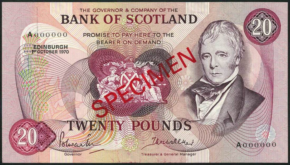 Bank of Scotland, specimen £5 (4), including dates 1991, 1993 and 1994, and specimen £20 (2), 1970, blue and purple respectively, all with Robert Burns at right, arms at centre, red SPECIMEN overprints