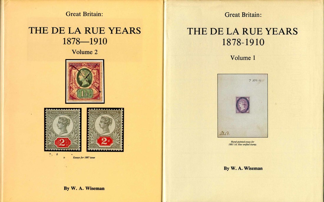 "The De La Rue years 1878-1910" by W.A. Wiseman, volume 1 (76 of 600 numbered copies and signed by the author) and 2, with dust jackets; fine. Also a quantity of notes regarding Departmental issues