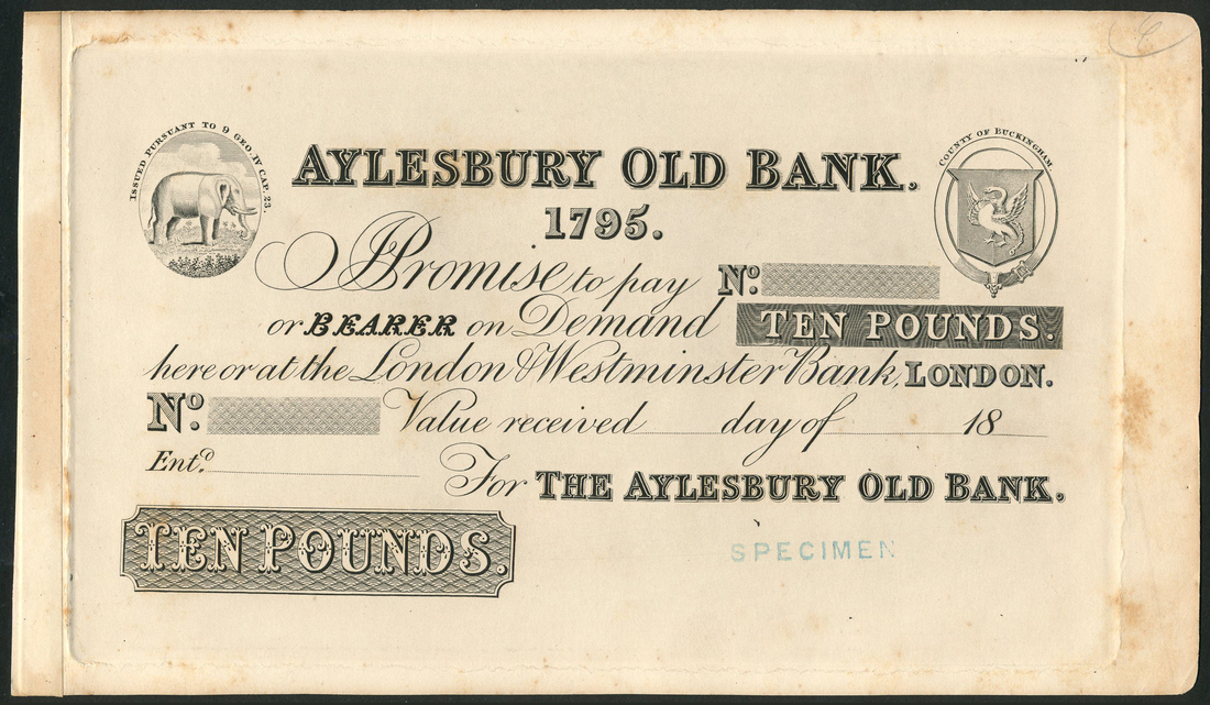 Aylesbury Old Bank, Buckinghamshire, £10, 18- (ca 1867), black and white, elephant vignette at top left, arms at top right, value at low left and at centre right