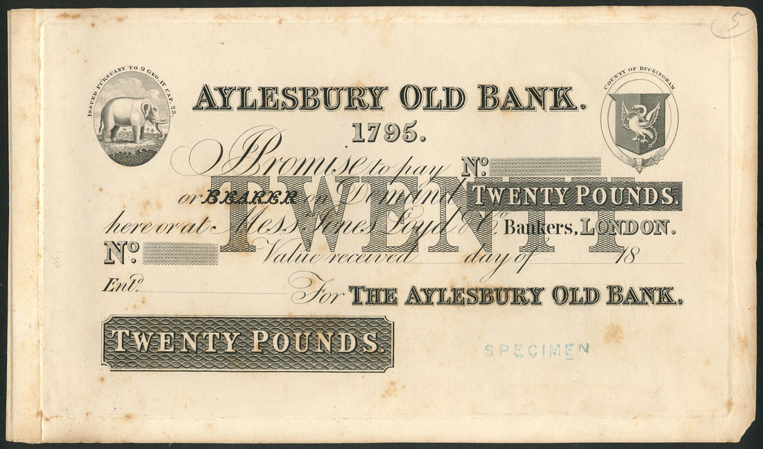 Aylesbury Old Bank, Buckinghamshire, an obverse and reverse proof £20, 18- (ca 1867), black and white, elephant vignette at top left, arms at top right, value in grey protector at centre, at low left and at centre right, reverse grey, bank title