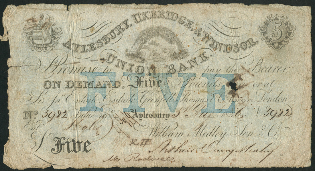Aylesbury, Uxbridge & Windsor Union Bank (William Medley, Son & Co), £5, 5 August 1836, serial number 5982, black, blue and white, arms at top left, value at top right and bottom left, manuscript signature of Arthur Medley at low right, bankers arms in blue on reverse