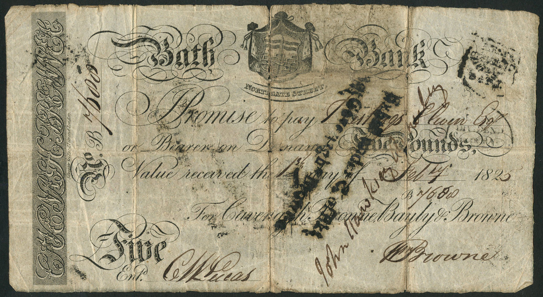 Bath Bank (Cavenagh, Browne, Bayly & Browne), £5, 1 February 1825, serial number B7688, black and white, coat of arms top centre, 'Northgate Street' below, two manuscript signatures, reverse, revenue seal