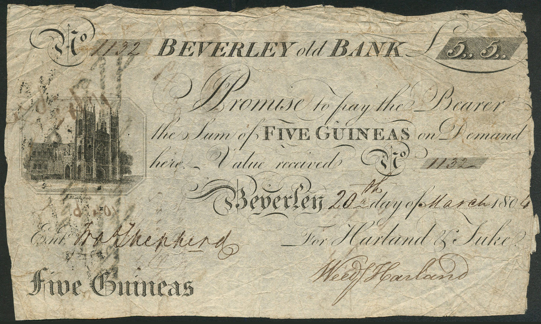 Beverley Old Bank (Harland & Tuke), 5 guineas, 20 March 1804, serial number 1132, black and white, Beverley church at left, manuscript signature of Harland low right