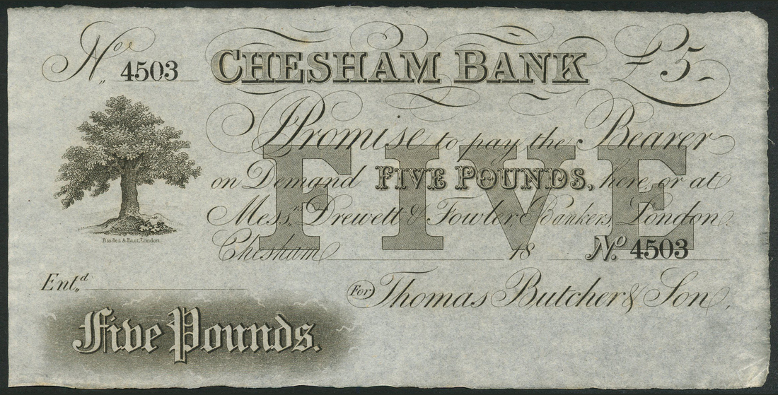 Chesham Bank (Thomas Butchers & Son), unissued £5, 18-, serial number 4503, black and white, vignette of an Oaktree at left, value at top right, low left and centre,