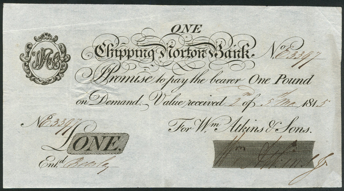 Chipping Norton Bank (Wm. Atkins & Sons), £1, 2 May 1815, serial number E 3397, black and white, value at lower left and top centre, arms at top left with bankers' initials, manuscript signature of Wm. Atkins low right