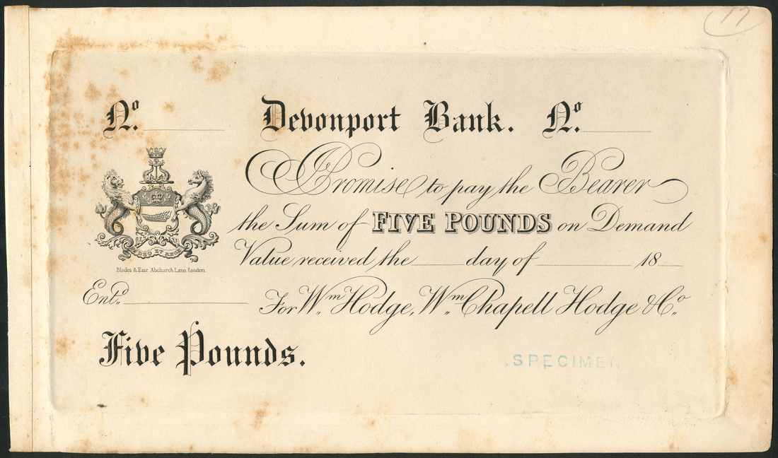 Devonport Bank (Wm Hodge, Wm Chapell Hodge & Co.), proof £5 on card, 18- (1855-1889), black and white, coat of arms at left