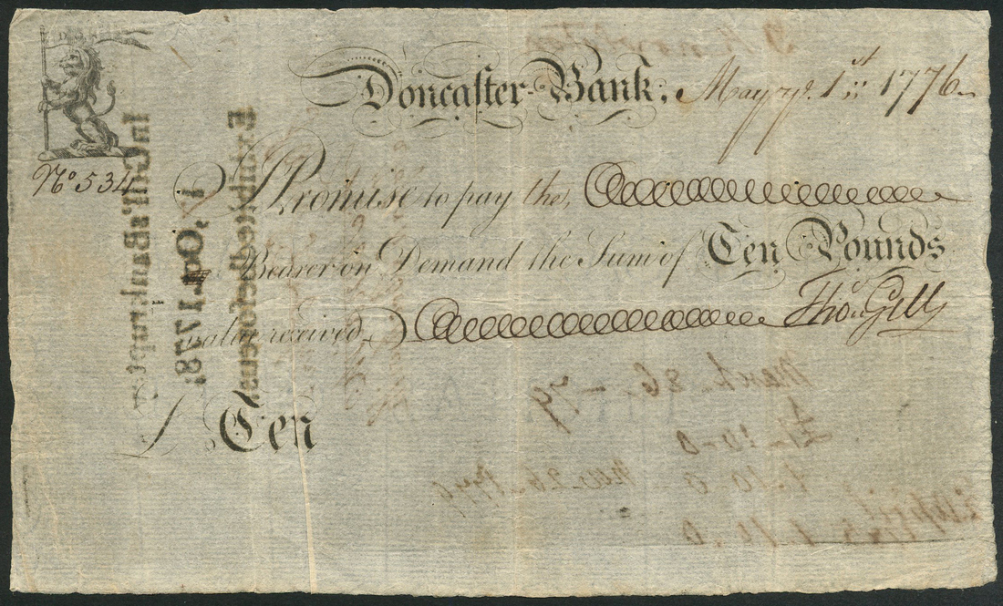 Doncaster Bank, £10, 1 May 1776, serial number 534, black and white with arms top left and manuscript 'Thos.Gill' in field