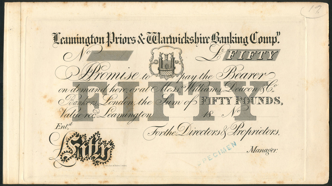 Leamington Priors & Warwickshire Banking Company, an obverse and reverse proof £50 on card, 18- (1835-1880), black and white, value at lower left, right, top right, and centre as protector in grey, seal at top left, reverse grey, bank title