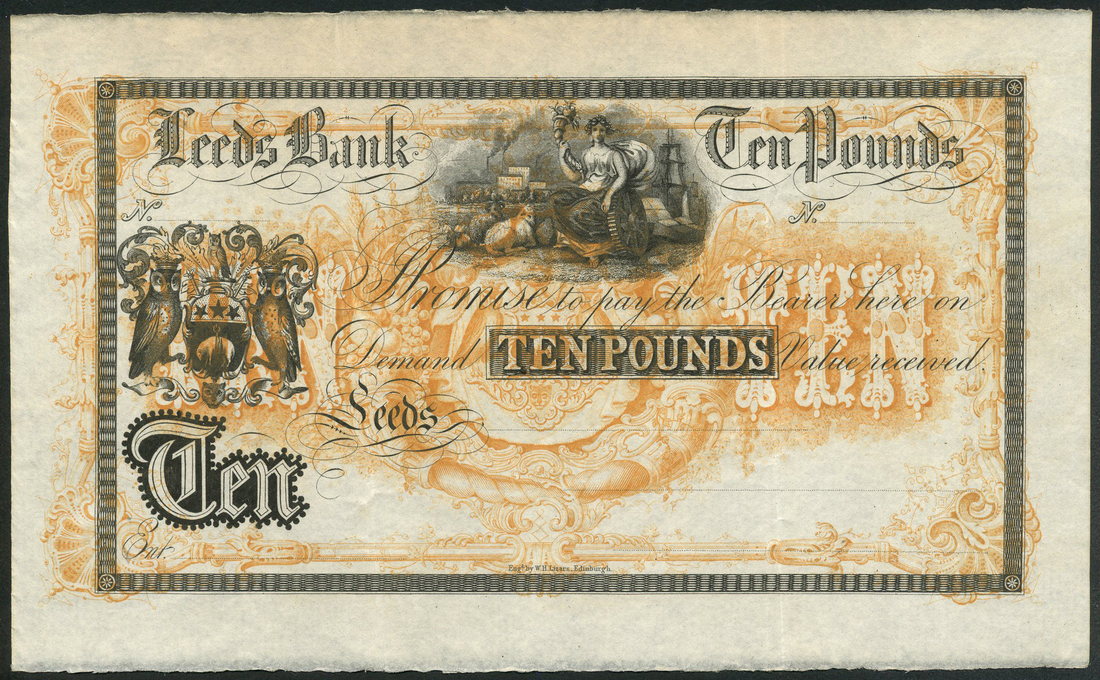 Leeds Bank, proof/specimen £10, ND, black with yellow underprint, arms at left, maiden with cornucopia and symbols of industry and commerce at top centre, also, Leeds and West Riding Banking Company, proof £5 on card, 18--, black and white, allegorical maidens, Prosperity and Industry top centre, value in black tablet at centre and value top left and right