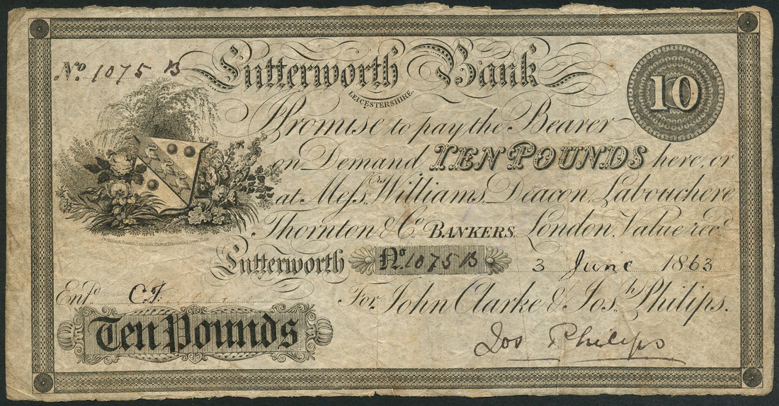 Lutterworth Bank (John Clarke & Josh Philips), £10, 3 June 1863, serial number 1075B, black and white, arms surrounded by flowers and plants at left, value at top right and low left, signature of Joseph Philips at low right