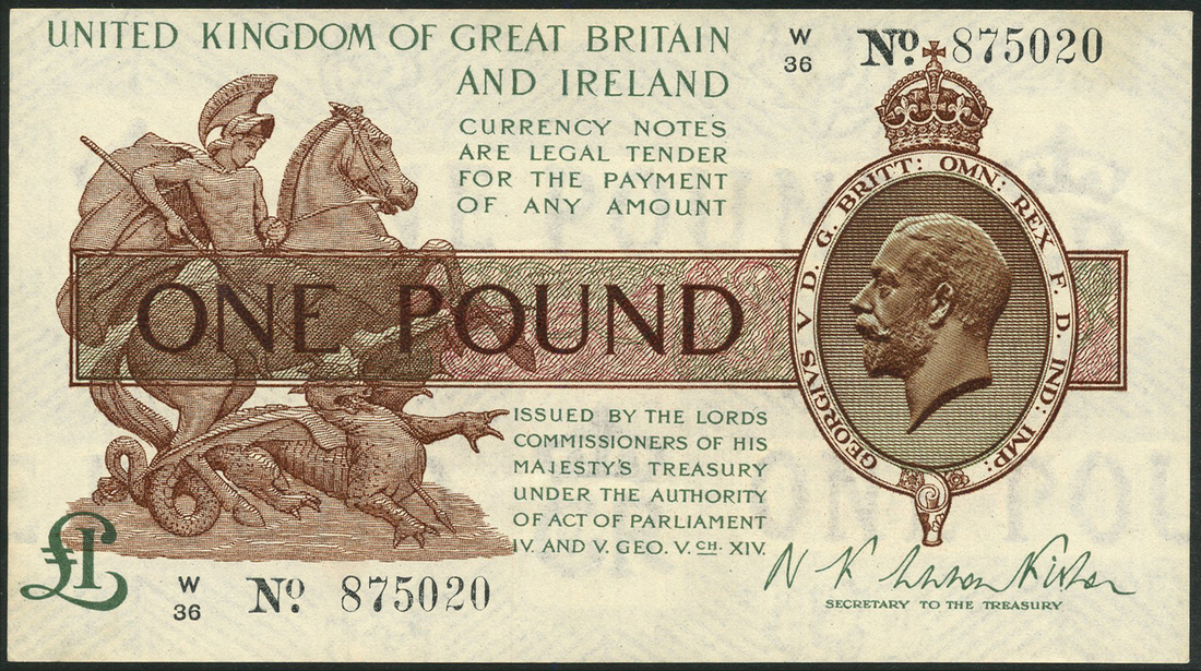 Treasury Series, N F Warren Fisher, £1, ND (1919), serial number W36 875020 brown and olive green, crowned head of George V at right, St George and dragon at left, value in table at centre, reverse, Houses of Parliament