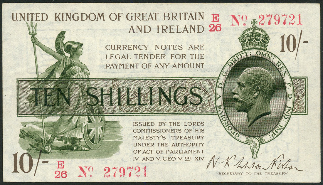 Treasury Series, N F Warren Fisher, 10 shillings, ND (1919), red serial number E/26 279721, green, lilac and white, crowned head of George V at right, Britannia at left