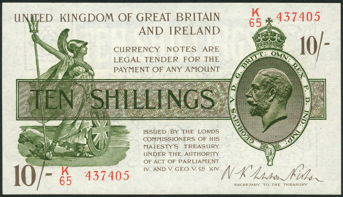 Treasury Series, N.F.Warren-Fisher, 10 shillings, ND (1922), red serial number K/65 437405, green, lilac and white, crowned head of George V at right, Britannia at left, also £1, prefix B1/9, brown, green, lilac and white, Saint George and the dragon at left