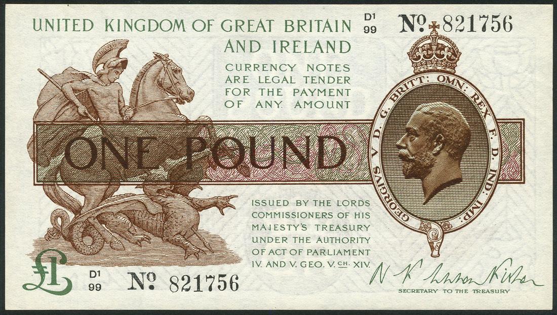 Treasury Series, N F Warren Fisher, consecutive £1, ND (1923), serial number D1 99 821756-7, brown and olive green, crowned head of George V at right, St George and dragon at left, value in table at centre, reverse, Houses of Parliament