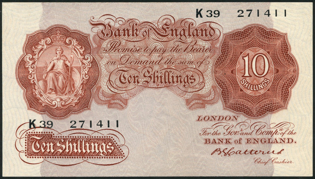 Bank of England, B.G.Catterns, 10 shillings, ND (1930), serial number K39 271411, red, Britannia at top left, value at top right and low left