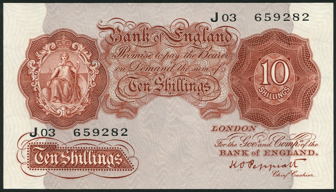 Bank of England, K.O.Peppiatt, 10 shillings (2), ND (1934), serial numbers J03 659282 and A58 114165, red, Britannia at top left, value at top right and low left