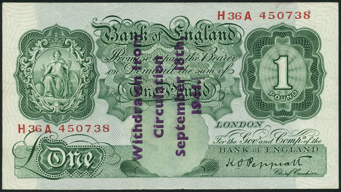 States of Guernsey overprints, K.O.Peppiatt, £1, 1941, serial number H36A 450738, green, Britannia at left, value at right, purple overprint 'Withdrawn from circulation September 18th 1941..' at centre