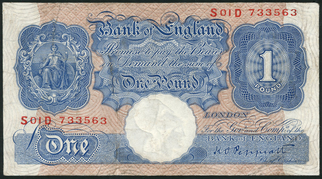 Bank of England, K.O. Peppiatt, Emergency issue, replacement £1, ND (1940), serial number S01D 733563, blue on red underprint, 10/-, ND (1948), serial number S01D 782856, mauve print, both with Britannia at left, value at right and low left