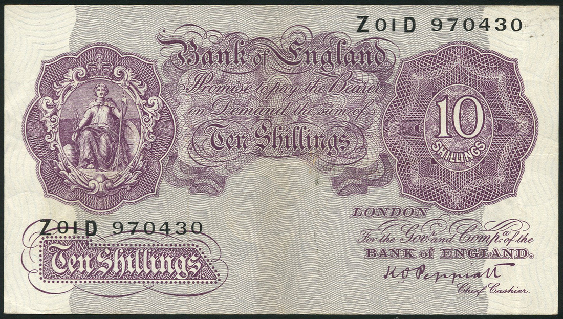 Bank of England, K.O.Peppiatt, 10 shillings, ND (1940), serial number Z01D 970430, mauve, Britannia at left, value at right