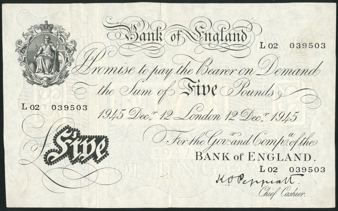 Bank of England, K.O.Peppiatt, £5, 12 December 1945, serial number L02 039503, black and white, ornate crowned vignette of Britannia top left, value in black tablet low left