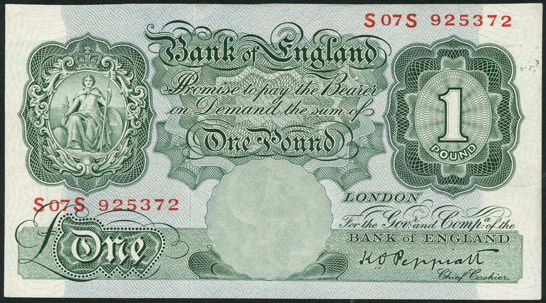 Bank of England, K.O. Peppiatt, £1, ND (1948), serial number S07S 925372, green on blue underprint, Britannia at left, value at right and low left