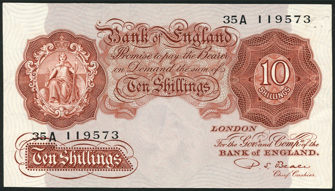 Bank of England, P. S. Beale, 10 shillings, ND (1950), serial number 35A 119573, reddish brown, seated Britannia at left, bank title top centre, value low left, centre and top right,