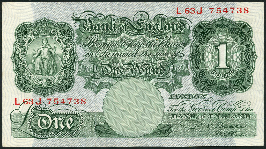 Bank of England, P. S. Beale, £1, ND (1950), serial number L63J 754738, green and pale blue, ornate crowned vignette of Britannia at left, value at right