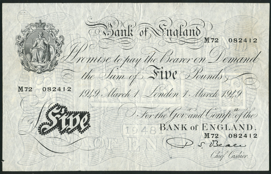 Bank of England, P. S. Beale, £5, London, 1 March 1949, serial number M72 08412, black and white, ornate crowned vignette of Britannia at top left, value in black tablet at low left